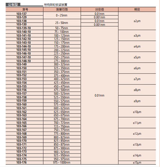 外徑千分尺103系列墨綠色的光滑烤漆架。棘輪鎖定裝置或摩擦套管可確保精確的重復精度。帶一套基準桿(不包括0-25mm 型)。